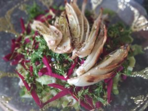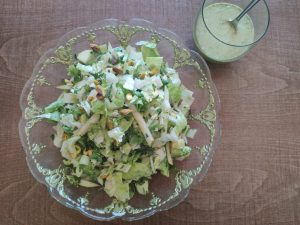 סלט ורוטב ירוקים. למה כל הירוק הזה?  הצבע העז הזה בעלים ירוקים מעיד על חומר הנקרא "כלורופיל". הכלורופיל עוזר לנקות את הדם והתאים מרעלנים, נלחם במחלות ונותן קפיצה של אנרגיה.