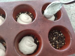 ממלאים את המנג'טים מעל הקלתית (בשביל המיני עוגת גבינה שוקולד- שקדים)